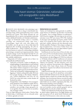 Östra Medelhavet präglas sedan ett drygt år av svåra spänningar mellan å ena sidan Turkiet och å andra sidan Grekland och Cypern, stödda av EU, samt Egypten, Israel och Förenade arabemiraten. Ankararegeringen har gång på gång sänt in örlogs- och forskningsskepp i omstridda havsområden för att söka efter naturgas och utmana sina rivaler. Situationen är mycket besvärande för EU, som slits mellan skilda uppfattningar om hur man ska bemöta de turkiska framstötarna, och för NATO, som riskerar att förlamas av turkisk-grekisk oenighet. Dagens kris har växt fram ur tre sammanflätade problemkomplex: segdragna havsrättsliga konflikter mellan Turkiet och dess grannländer, inklusive den turkiska ockupationen av norra Cypern; en allt mer offensiv turkisk utrikespolitik, med interventioner i Syrien och Libyen; och upptäckten av stora naturgasresurser i östra Medelhavet under 2010-talet. I denna text beskriver Aron Lund, analytiker vid FOI:s Asien- och Mellanösternprojekt, krisens bakgrund och drivkrafterna bakom Turkiets agerande.